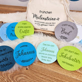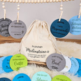 Du erhältst 20 Meilensteine mit einem Durchmesser von ca. 10cm. Dazu bekommst du einen Geschenkbeutel aus 100% Baumwolle mit dem Aufdruck "Frühchen Meilensteine, Glücksmomente, wenn der Start ins Leben intensiv beginnt"