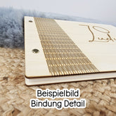Unser Umschlag ist so gestaltet, dass er wie ein herkömmlicher Buchdeckel umgeschlagen kann, obwohl er voll aus Holz besteht (s. Detail-Beispielbild). Die Bindung an sich besteht aus fest verschraubten Buchbinderschrauben. Muss ein Blatt getauscht oder entnommen werden, kannst du diese mit einem herkömmlichen Schraubendreher lösen und wieder festschrauben. Den Buchdeckel niemals umschlagen und platt drücken, dies könnte die filigranen Schnitte brechen lassen.