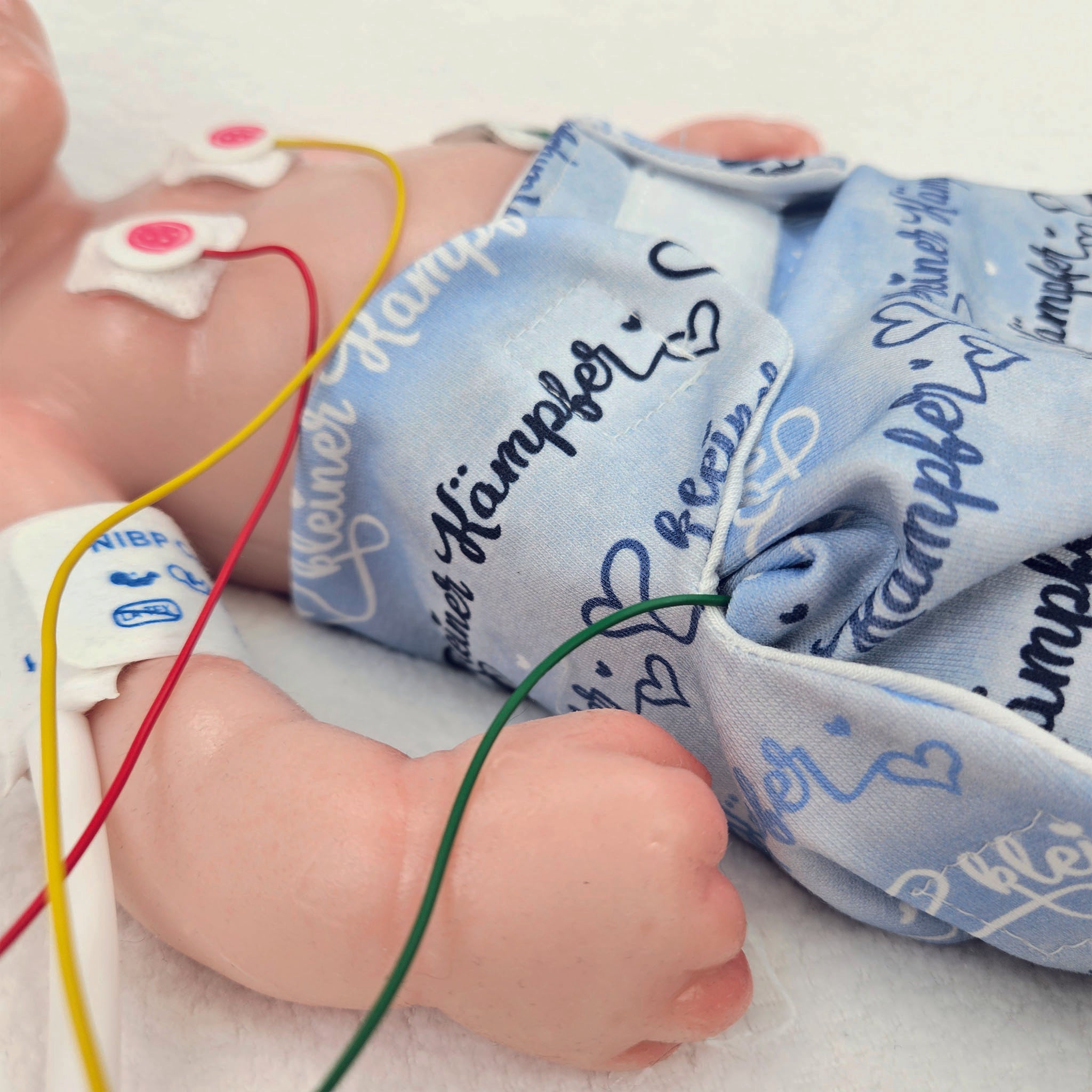 Unsere Frühchenkollektion wurde in Zusammenarbeit mit Ärzten und Pflegepersonal entwickelt und im Alltag erprobt. Unser Hauptaugenmerk lag nicht nur auf der Passform, sondern auch auf den pflegerischen und medizinischen Anforderungen. Mit unseren einfach zu handhabenden Schnitten ist es den Frühcheneltern möglich, die Pflege ihres Babys schon zu einem sehr frühen Zeitpunkt zu übernehmen. Durch die frühe Versorgung durch die Eltern kann viel schneller eine emotionale Bindung aufgebaut/ intensiviert werden, die das Risiko von Entwicklungsdefiziten beim Baby reduziert und traumatische Erfahrungen auf elterlicher Seite minimiert.