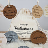 Du erhältst 20 Meilensteine mit einem Durchmesser von ca. 10cm. Dazu bekommst du einen Geschenkbeutel aus 100% Baumwolle mit dem Aufdruck "Frühchen Meilensteine, Glücksmomente, wenn der Start ins Leben intensiv beginnt"