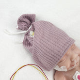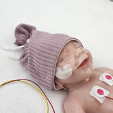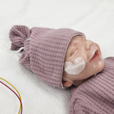 Speziell für die Intensivversorgung von Frühgeborenen entwickelte Mütze/Wickelmütze mit Zugangsöffnung, z.B. für Infusionen.