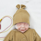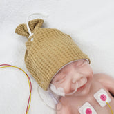 Speziell für die Intensivversorgung von Frühgeborenen entwickelte Mütze/Wickelmütze mit Zugangsöffnung, z.B. für Infusionen.