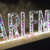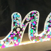 Großes, personalisiertes Nachtlicht Glitter-Konfetti türkis lila weiß, LED Lampe mit Wunschname personalisiert
