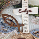 Dieses Taufkreuz / Segnungskreuz stellen wir individuell für dich hier vor Ort her und gestalten es vollumfänglich nach deinen Wünschen (Wunschname, Wunschtext).