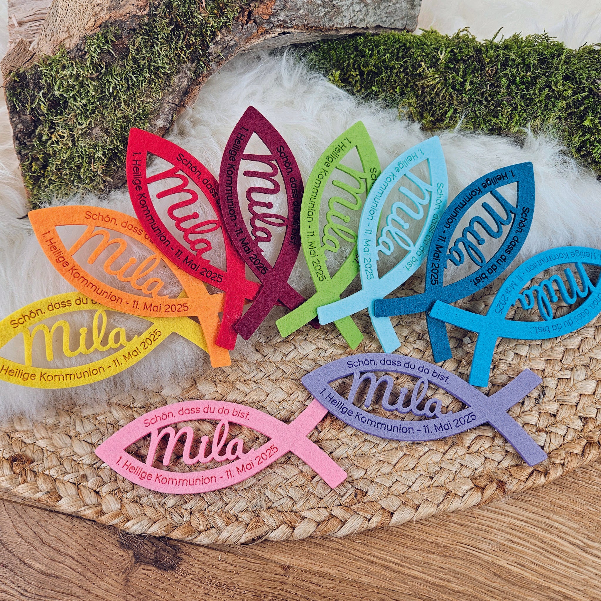 Personalisierte Tischdeko "große Fische" Regenbogenfarben (ohne rosa) für Kommunion, Taufe, Konfirmation, SegnungPersonalisierte Tischdeko "große Fische" Regenbogenfarben (ohne rosa) für Kommunion, Taufe, Konfirmation, Segnung- Regulärer Preis