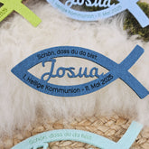 In die Mitte des Fisches wird der Name des Täuflings/Kommunionkindes/Konfirmanden eingearbeitet und fest mit der Umrandung in Fischform verbunden, ganz individuell.