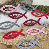 In die Mitte des Fisches wird der Name des Täuflings/Kommunionkindes/Konfirmanden eingearbeitet und fest mit der Umrandung in Fischform verbunden, ganz individuell.