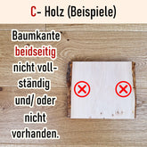 Die Besonderheit unsere Holzbilder dieser Art besteht nicht nur darin, dass wir ausschließlich heimische Bäume dafür verwenden, die ohnehin gefällt werden mussten. Wir wählen jedes Stück von Hand aus und achten darauf, dass die Baumrinde möglichst vollständig erhalten ist. Leider ist genau das in der Verarbeitung des Holzes der "Knackpunkt". Häufig fällt ein Teil der Rinde bei Trocknung ab oder wird durch die maschinelle Verarbeitung (sägen) beschädigt. Das perfekte Holzstück zu ergattern, ist also immer ein wenig wie ein Lottogewinn. Daher kannst du unterschiedliche Qualitäten in Sachen Rinde kaufen: