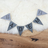 Personalisierte Wimpelkette aus hochwertigem Filz, individuell mit deinem Wunschnamen und Wunschtext graviert. In schlichten Grautönen ein zeitloser Begleiter.